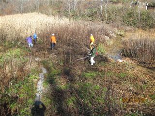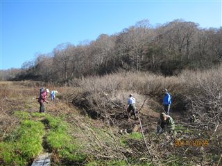 水芭蕉群生池周辺の柴の除去、笹や傍芽した灌木の刈り払い土留め堤の補強など心地よい汗を流しました。
